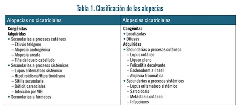 La tricología se encarga principalmente del estudio de las alopecias. Dichas alopecias clásicamente se han clasificado en dos grandes grupos: alopecias no cicatriciales y alopecias cicatriciales. Esta distribución se basa principalmente en la posibilidad de repoblación del cabello perdido. Las alopecias no cicatriciales más importantes son la alopecia androgenética, el efluvio telógeno y la alopecia areata. Por su parte, las alopecias cicatriciales más frecuentes son la alopecia frontal fibrosante, el liquen plano pilar y la foliculitis decalvante.