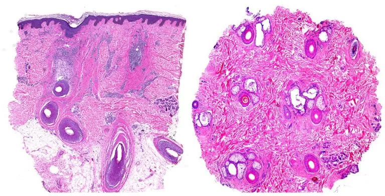 En casos de duda diagnóstica puede resultar clave la realización de una biopsia (o dos) para estudio anatomopatológico. Habitualmente se realiza mediante la toma de un cilindro punch de 4 mm guiada por tricoscopia, para seleccionar una zona representativa de alta actividad y así optimizar el estudio. Para un estudio óptimo, se recomienda la toma de dos biopsias, para realizar cortes longitudinales y transversales de la muestra. Sin embargo, con una buena orientación clínica, en la mayoría de casos será suficiente con una muestra. En caso de las alopecias cicatriciales los cortes más útiles son los longitudinales, mientras que los transversales son clave para las alopecias no cicatriciales.