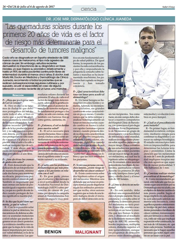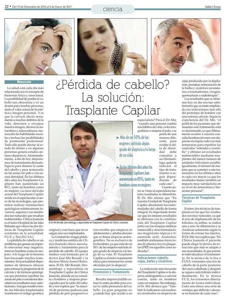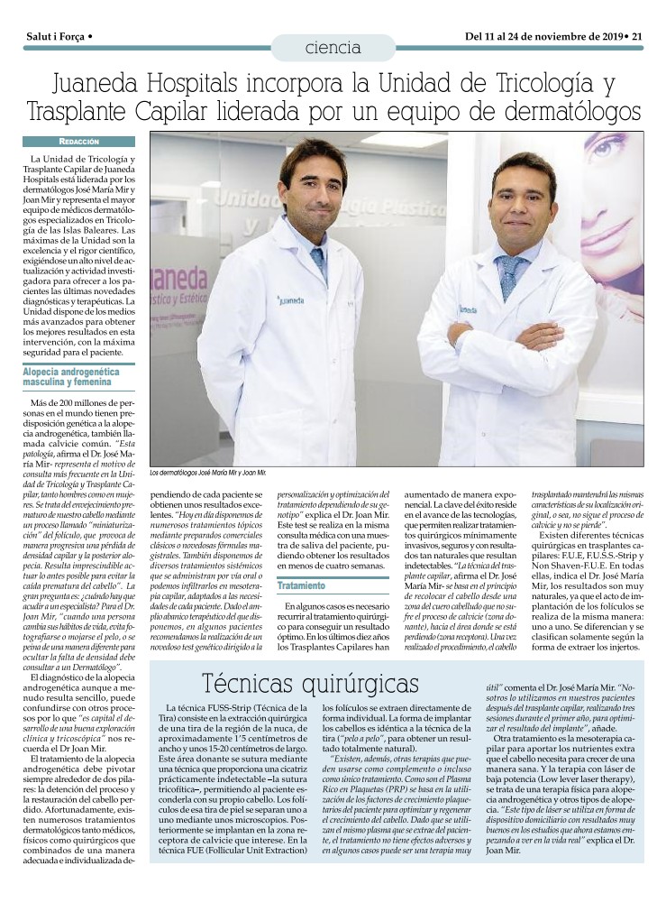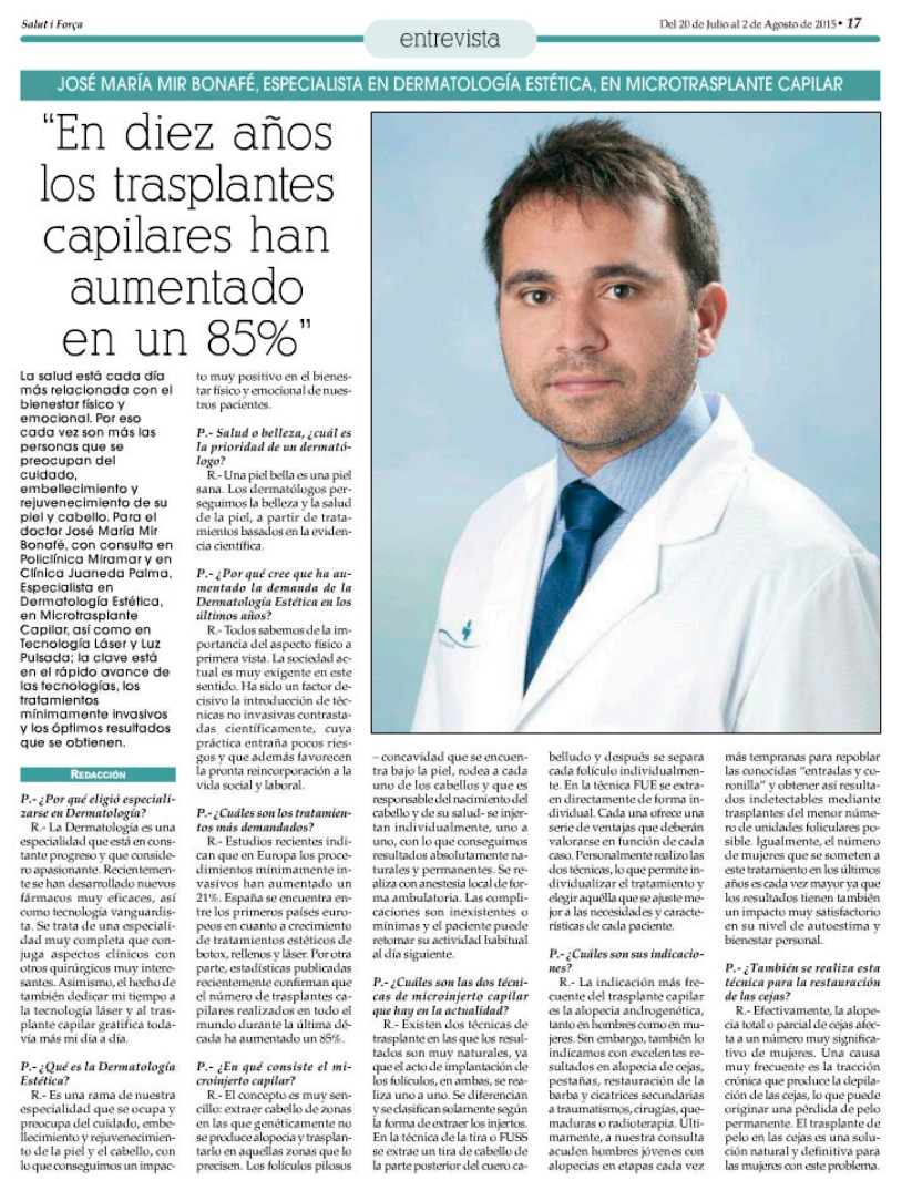 La Unidad de Tricología y Trasplante Capilar compuesta por los dermatólogos José María Mir y Joan Mir está muy presente en los medios de comunicación como referentes en Mallorca y Baleares no sólo en tricología y trasplante capilar, sino también en otros temas dermatológicos de actualidad.